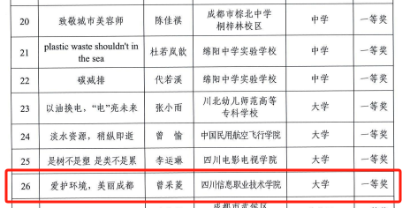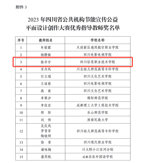 近日,省机关事务管理局、省教育厅公布了“2023年四川省公共机构节能宣传平面设计大赛”获奖名单,软件学院学生曾采菱创作的平面设计作品《爱护环境,美丽成都》获大学组一等奖,指导教师熊垚宇被评为“优秀指导教师”。