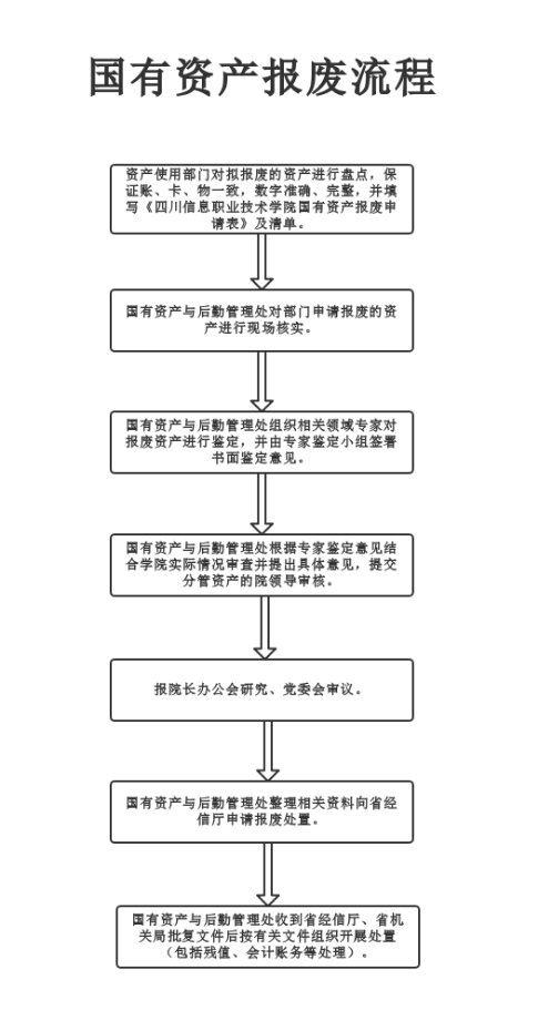 (六)国有资产与后勤管理处收到省经信厅、省机关局批复文件后根据四川省机关事务管理局关于印发《四川省省级机关国有资产处置服务平台管理实施细则(暂行)》的通知(川机管发[2019]66号)文件组织开展处置(包括残值、会计账务、产权变动等处理)。